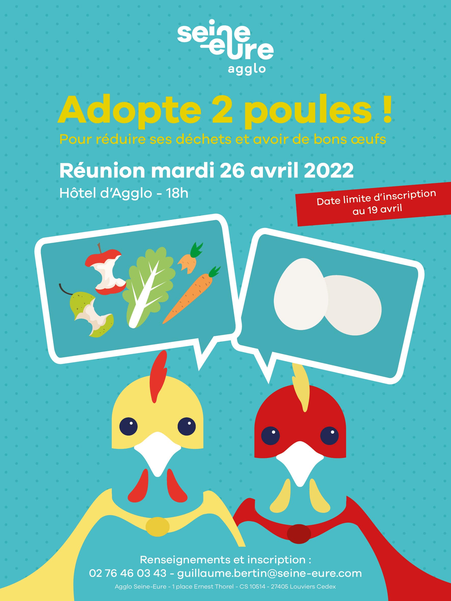 Vous trouverez en pièce jointe l’affiche pour l’opération adopte deux poules du 26 avril 2022. Il reste encore des places pour les habitants de l’agglo seine eure, désirant obtenir des poules gratuitement.